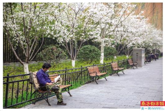 3月22日,中山大道,路边盛开的樱花树下,市民在长椅上看书。