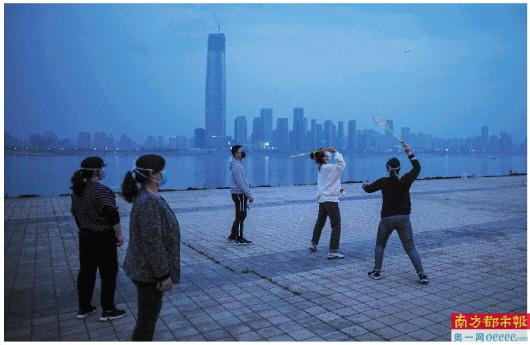 3月24日傍晚,武汉汉口江滩,一家人在江边打羽毛球。江滩休闲的市民逐渐多了起来,其中不少市民是武汉封城以来第一次出门。市民凭借武汉健康码,测体温后就可以进入江滩。当日,湖北省新冠肺炎疫情防控指挥部发布通告,湖北省除武汉市以外地区,将于3月25日起解除离鄂通道管控,武汉市将于4月8日起解除离汉离鄂通道管控措施。 南都特派记者 钟锐钧 摄