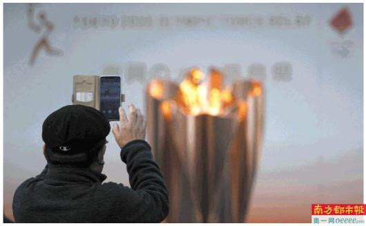 3月24日,在日本福岛,一名男子拍摄展出的东京奥运会火炬台。而在当晚官方宣布火炬传递活动暂时取消。 新华社发