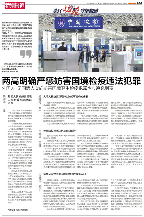 当前新冠肺炎疫情在境外呈现扩散态势,输入性风险加剧,“两高”明确应严惩妨害国境卫生检疫的各类违法犯罪行为。3月24日,针对依法惩治妨害疫情防控违法犯罪等问题,最高人民法院研究室主任姜启波、最高人民检察
