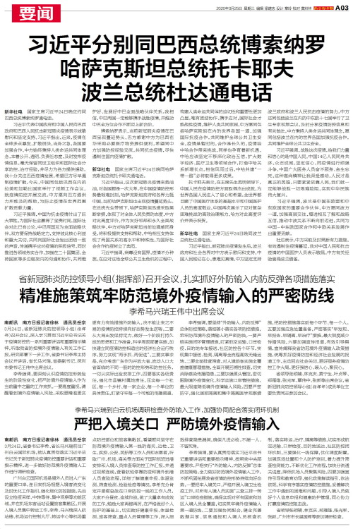 南都讯 南方日报记者徐林 通讯员岳宗 3月24日,省新冠肺炎防控领导小组(指挥部)召开会议,深入学习贯彻习近平总书记关于疫情防控的一系列重要讲话和重要指示精神,听取我省防控境外疫情输入有关工作汇报,研
