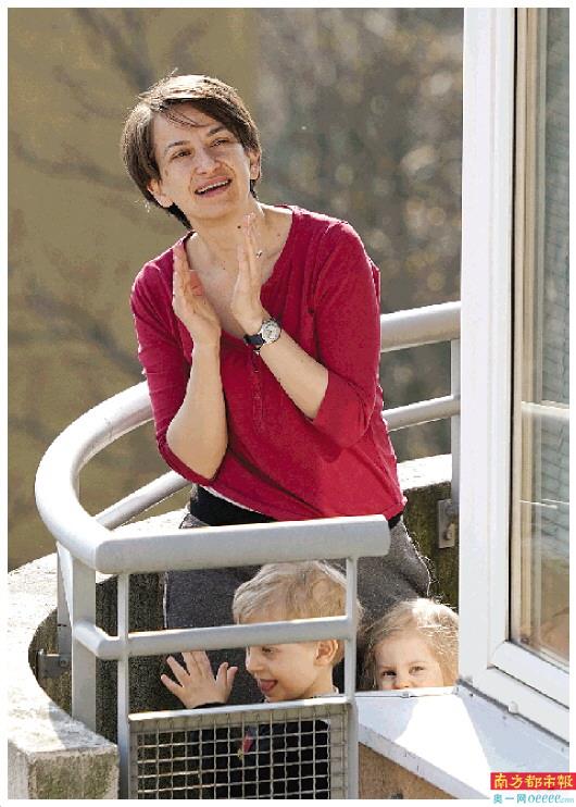 3月28日,在波兰华沙,邻居欣赏歌唱家米哈乌·亚尼茨在阳台上的表演。新华社发