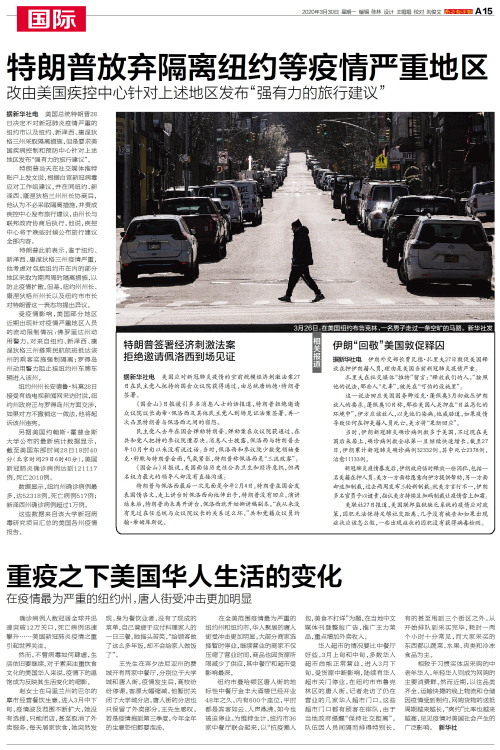 据新华社电 美国总统特朗普28日决定不对新冠肺炎疫情严重的纽约市以及纽约、新泽西、康涅狄格三州采取隔离措施,但是要求美国疾病控制和预防中心针对上述地区发布“强有力的旅行建议”。特朗普当天在社交媒体推特
