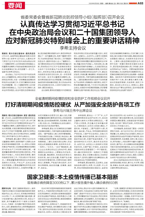 南都讯 南方日报记者徐林 通讯员岳宗 3月29日,省委常委会暨省新冠肺炎防控领导小组(指挥部)召开会议,认真传达学习贯彻习近平总书记在中央政治局会议和二十国集团领导人应对新冠肺炎特别峰会上的重要讲话精