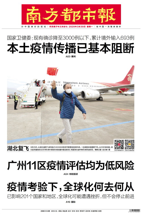 3月29日,从湖北襄阳飞深圳的ZH9338次航班平稳落地宝安机场,一位乘客拿着国旗下机。从29日零时起,湖北省恢复除武汉天河机场外其他机场的国内客运航班,恢复湖北省所有机场货运航班。 南都记者 赵炎雄
