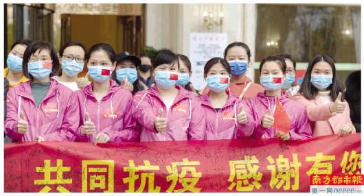 3月31日早上,湖北武汉,即将前往机场的金银潭医院广东医疗队“十朵金花”在出发前与金银潭医院护士合影。