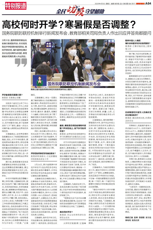 3月31日,国务院联防联控机制举行新闻发布会,针对低风险区开学复课后疫情防控、高校开学时间、海外留学生确诊及诊治情况等热点问题,教育部相关司局负责人作出回应。开学复课是否要戴口罩?教育部:在教室必须戴