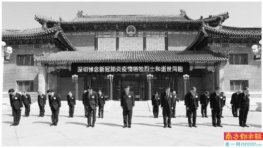 中南海怀仁堂前气氛庄严肃穆,门楣上悬挂着黑底白字横幅“深切悼念新冠肺炎疫情牺牲烈士和逝世同胞”。习近平等佩戴白花,来到这里,神情凝重面向国旗肃立。
