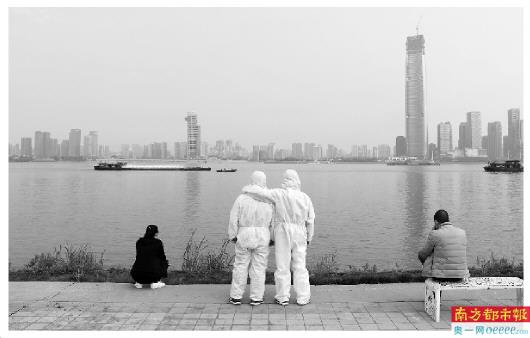 4月4日,汉口江滩,穿着防护服的市民相拥在岸边遥望。