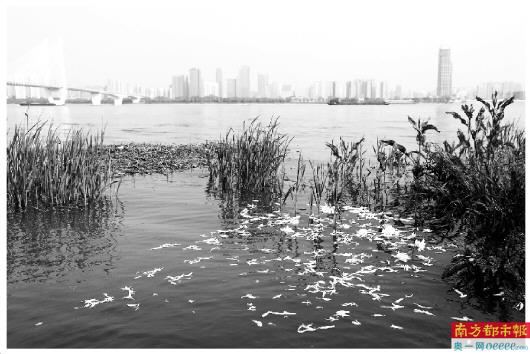 4月4日,清明节。汉口江滩,江面上漂浮着悼念的花瓣,寄托着人们的哀思。