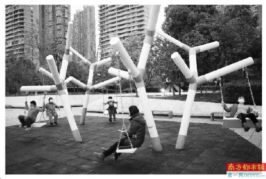 4月1日,汉阳江滩公园,荡秋千的市民。