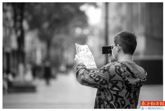 4月3日,江汉路,市民拍下当日报纸头版做纪念,此时距离武汉“解封”已进入倒计时。