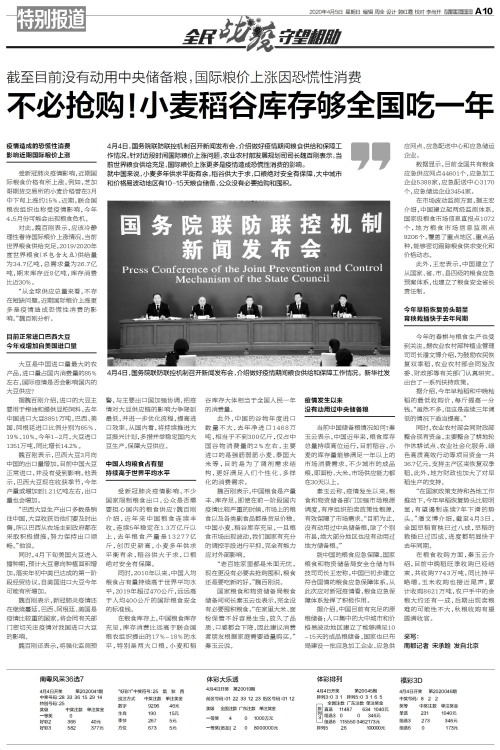 4月4日,国务院联防联控机制召开新闻发布会,介绍做好疫情期间粮食供给和保障工作情况。 新华社发