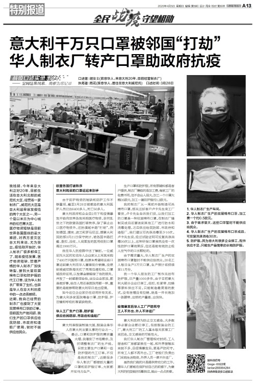 意大利千万只口罩被邻国“打劫” 华人制衣厂转产口罩助政府抗疫