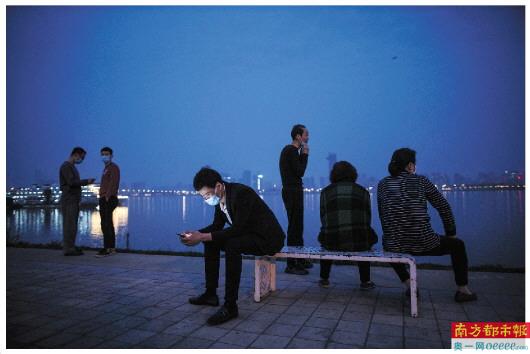 3月24日,汉口江滩,市民饭后在江边闲聊。