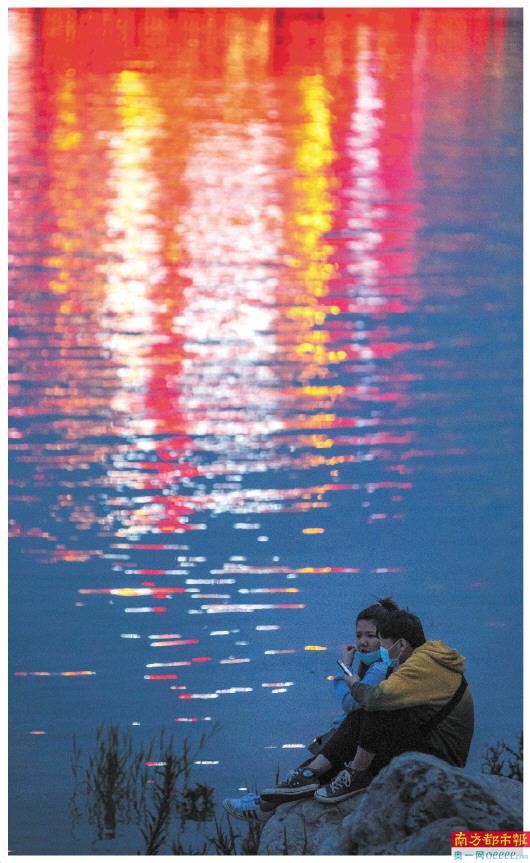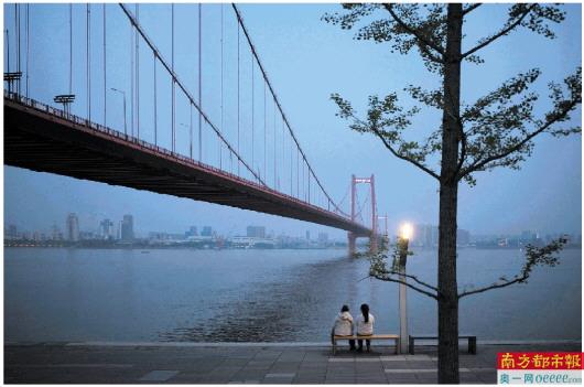 4月1日,汉阳,鹦鹉洲大桥下,两位市民在晚饭前来到江边散步休息。