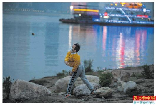 4月5日傍晚,汉口江滩,孩子跃起往长江扔石块。