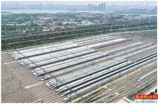 4月6日,武汉动车段高铁动车组整装待发(无人机照片)。武汉市将于4月8日起解除离汉离鄂通道管控措施。武汉铁路相关工作人员连日来忙碌在工作岗位上,为4月8日列车开行做准备。 南都特派记者 张志韬 摄