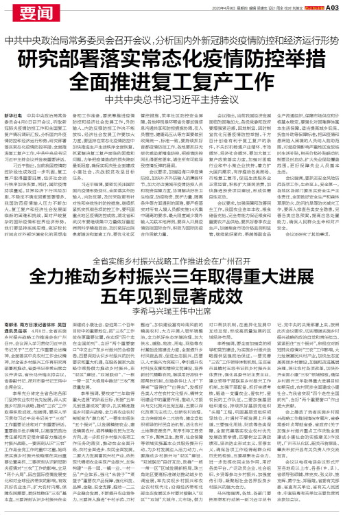 新华社电 中共中央政治局常务委员会4月8日召开会议,听取新冠肺炎疫情防控工作和全国复工复产情况调研汇报,分析国内外疫情防控和经济运行形势,研究部署落实常态化疫情防控举措、全面推进复工复产工作。中共中央