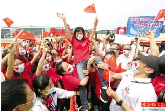 昨日,广东驰援武汉的最后一批医疗队队员抵达广州白云机场,到家的队员们激动万分,将一名同事高高抬起。自1月24日开始,广东共派出26批次共2493名医疗队队员,千里驰援湖北武汉和荆州等地。至此,广东援助湖北医疗队全部返回。 南都记者 冯宙锋 摄 A06·特别报道