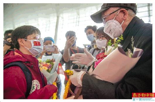 4月8日,天河机场,援助接管武汉协和西院ICU的广东危重症救治医疗队返粤。患者家属前来送行时眼含泪光。