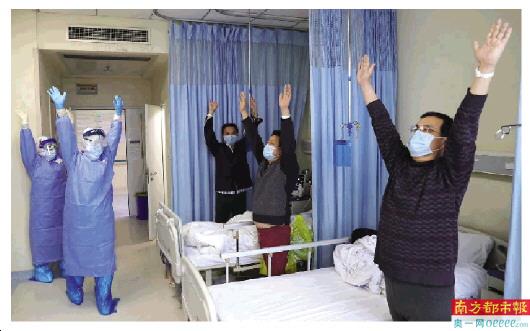 3月8日,武汉协和医院西院住院楼,来自广东的医护人员指导新冠患者进行康复训练。