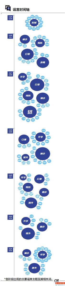 南都大数据研究院详细梳理时间线后发现,关于预防和消毒方法、确诊详情和口罩的谣言几乎贯穿整个疫情时期,同时,随着疫情发展,也有与封城、开学、境外疫情相关的“时令”谣言。