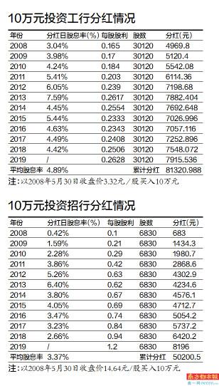 以工商银行、招商银行为例,除了2008年、2009年外,招行的每股股利都显著高于工行每股股利,那么是不是投资招行的分红总收益会高于工行?我们来算一笔账: