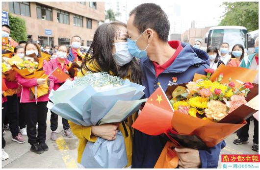 昨日上午,中山三院第三批支援湖北医疗队133名队员结束14天的休整,返回广州。至此,中山三院175名医疗队员全部平安回家。欢迎仪式上,战疫归来的中山三院急诊科男护士陈柏五现场向中山三院岭南医院隔离病区三区护士何丹丹求婚。“我愿意!”泪流满面的丹丹与爱人拥吻在一起。中山三院医疗队在武汉抗疫50天,整建制接管华中科技大学附属同济医院光谷院区一个重症病区。 南都记者 冯宙锋 摄