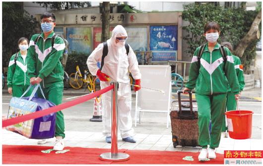昨日上午,在广州市越秀区育才实验学校,演练学生进入校门,工作人员对入校学生行李进行消毒。从4月14日开始,越秀区中学分批开展疫情应急处置演练,所有中学须在4月20日前完成演练。根据广东省新冠肺炎疫情防控指挥部要求,全省学校学生自4月27日起分期、分批、错峰返校。 南都记者 黎湛均 摄