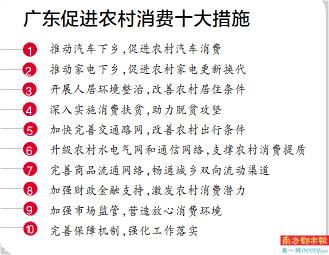 南都讯 记者吴璇 南都记者4月15日从广东省发改委获悉,为大力推动农村消费提质升级,更好满足农村居民日益增长的美好生活需要,广东出台《广东省关于促进农村消费的若干措施》(以下简称《措施》)。十大促进农村消费措施中包括开展2020年汽车下乡专项行动和家电下乡专项行动,对农村居民购车和购买家电给予补贴。根据《措施》,2020年,广东将实现全省20户以上自然村宽带网络全覆盖,珠三角9市乡镇和粤东西北县城实现5G网络覆盖。