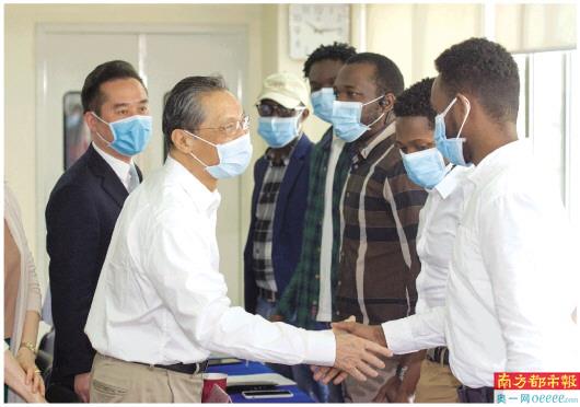 昨日上午,广州市政府新闻办举办第78场疫情防控新闻采访活动,中国工程院院士钟南山与在穗工作学习的19名外国籍人士代表座谈交流。入场后,钟南山院士和每一位外籍人士代表握手。 南都记者 梁炜培 摄