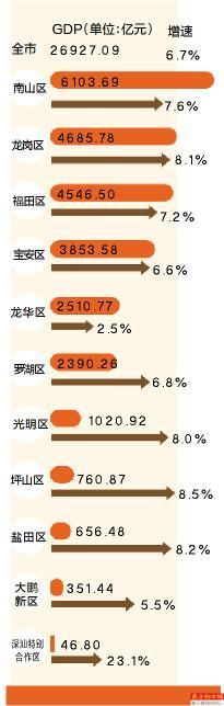 初步核算,2019年深圳实现地区生产总值26927.09亿元,比上年增长6.7%。在深圳“10+1”区(含深汕特别合作区)中,从分区GDP总量来看,与2018年相比,各区GDP总量的排位未有变化。
