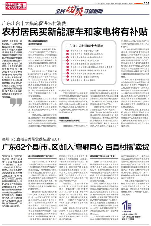 “吃援”湖北,“拼单”鄂货,广东一直在行动。4月15日是淘宝直播“415村淘日”,广东21个地市的62个县(市、区)的419种特色农产品走进直播间,在乡村主播们的推介下与“吃货”们“云见面”,各地还共