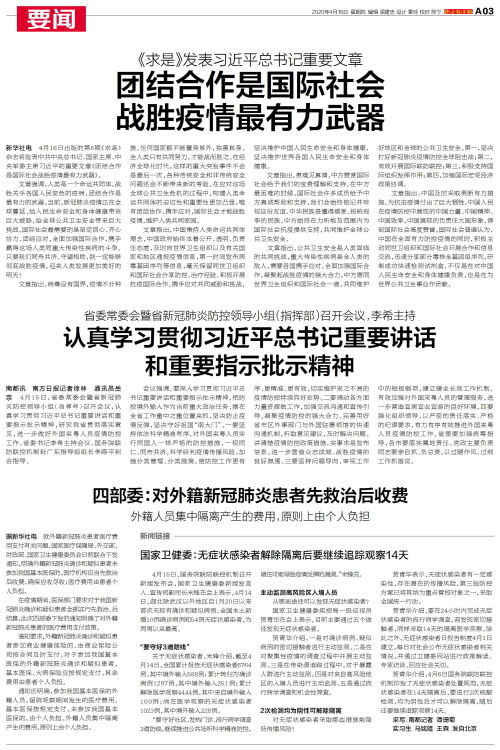 新华社电 4月16日出版的第8期《求是》杂志将发表中共中央总书记、国家主席、中央军委主席习近平的重要文章《团结合作是国际社会战胜疫情最有力武器》。文章强调,人类是一个命运共同体。战胜关乎各国人民安危的