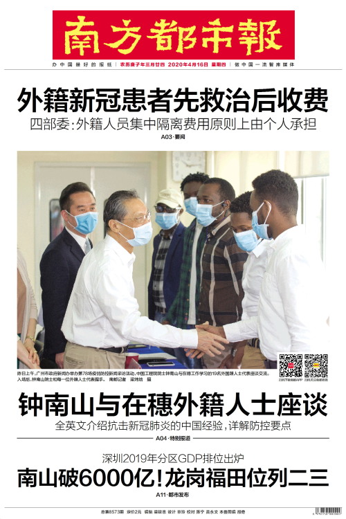 昨日上午,广州市政府新闻办举办第78场疫情防控新闻采访活动,中国工程院院士钟南山与在穗工作学习的19名外国籍人士代表座谈交流。入场后,钟南山院士和每一位外籍人士代表握手。 南都记者 梁炜培 摄 详见