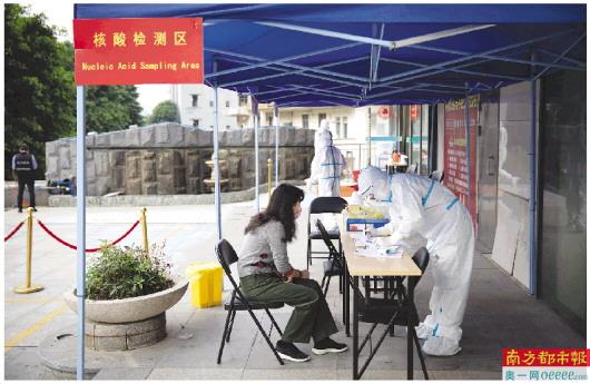 昨日,广州白云入境人员集中隔离点山水时尚酒店广州同和店,酒店门口设核酸检测区。3月27日起,从广州地区口岸入境人员,目的地为广州市及广东省外的,全覆盖进行核酸检测和隔离医学观察,全员闭环管理。 南都记者 何玉帅 摄