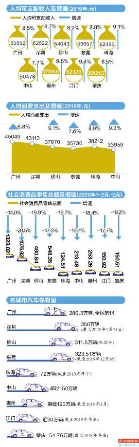 今年受疫情影响,珠三角九市中,社会消费品零售总额下跌最厉害的是深圳,跌幅高达20.5%。紧随其后的是佛山,跌幅为19.9%。珠海、中山同为19.7%。肇庆也在19%以上。