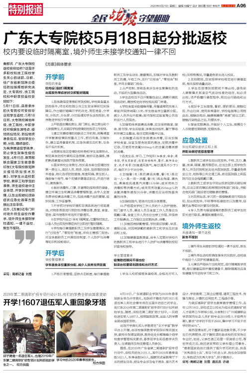南都讯 广东大专院校返校安排如何?这是许多职校和技工院校学生关心的话题。日前,经广东省新冠肺炎疫情防控指挥部研究决定,大专院校、技工院校和中职学校返校安排如下:5月11日后,具备条件的大专院校可安排毕