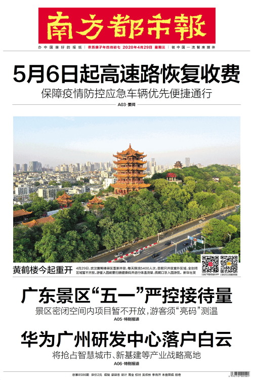 4月29日,武汉黄鹤楼景区重新开放,每天限流5400人次,目前只开放室外区域,全封闭区域暂不开放。游客入园前要扫描健康码并进行体温测量,佩戴口罩入园游览。 新华社发