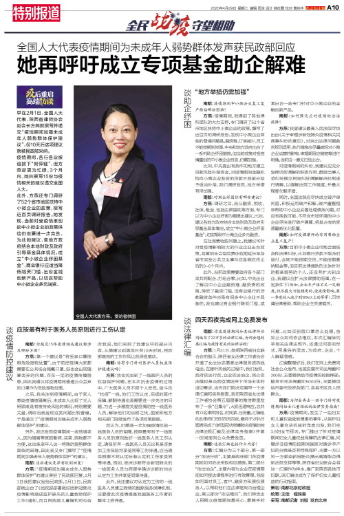 早在2月1日,全国人大代表、陕西省律师协会副会长方燕就撰写并递交“疫情期间加强未成年人弱势群体保护建议”,仅10天后这项建议就被民政部采纳。疫情期间,各行各业被迫按下“暂停键”,但方燕却更为忙碌,3个