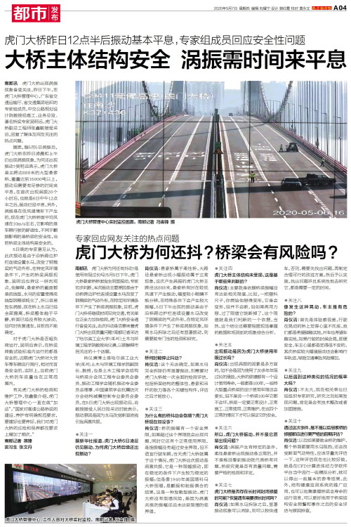 南都讯 虎门大桥出现涡振现象备受关注。昨日下午,在虎门大桥管理中心,广东省交通运输厅、省交通集团组织的专家组成员,中交公路规划设计院教授级高工、业务总监、著名桥梁专家吴明远,虎门大桥副总工程师张鑫敏接
