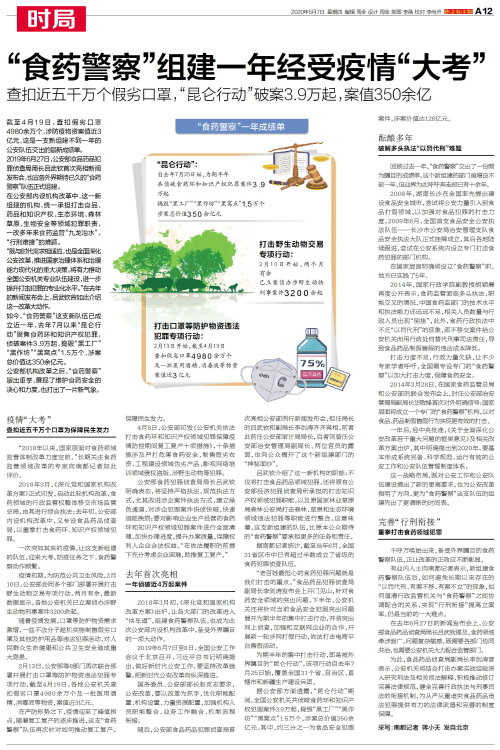 截至4月19日,查扣假劣口罩4980余万个,涉防疫物资案值近3亿元,这是一支新组建不到一年的公安队伍交出的最新成绩单。2019年6月27日,公安部食品药品犯罪侦查局局长吕武钦首次亮相新闻发布会,也宣告