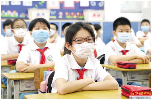 5月18日上午,广州林凤娥小学,戴着口罩的学生们在上防疫第一课。沉寂了五个月的广州小学校园重新响起了琅琅书声。广州市小学4—6年级约49万小学生终于返校复课了。校园里“网友”相见,分外激动,但也有学生坦承:“有几个同学,我一时之间认不出来了。”南都记者 冯宙锋 摄 详见:A11 都市发布