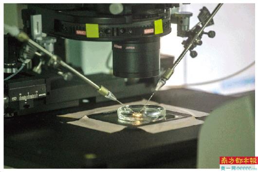 广州医科大学第三附属医院辅助生殖技术实验室里,医生在电子显微镜下对卵子进行第二代人工受精。 南都资料图