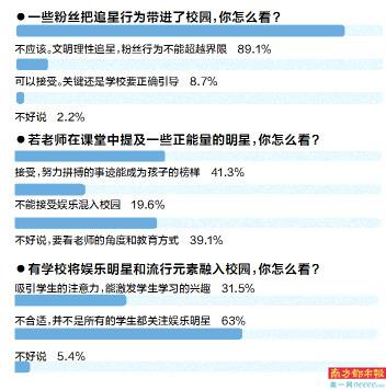 明星的影响力是不可忽视的,但是对于一些粉丝把追星行为带进校园这样的行为,引起了网友的强烈拒绝,有近九成受访网友认为,追星行为不应该进入校园,粉丝应该文明理性追星,粉丝行为不能超越界限。