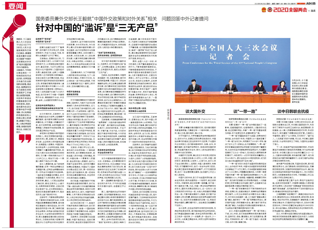 5月24日,十三届全国人大三次会议在北京人民大会堂举行视频记者会,国务委员兼外交部长王毅就中国外交政策和对外关系回答中外记者提问。 新华社发 南都讯 十三届全国人大三次会议于5