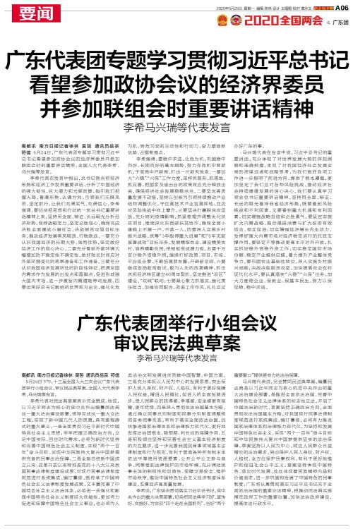南都讯 南方日报记者徐林 吴哲 通讯员岳宗 符信 5月24日下午,十三届全国人大三次会议广东代表团举行小组会议,审议民法典草案。全国人大代表李希、马兴瑞等发言。李希代表对民法典草案表示完全赞成。他说,
