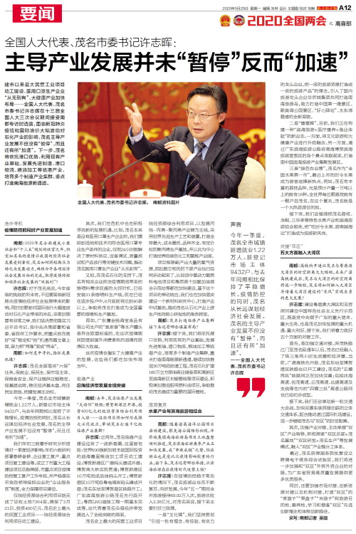 建市以来最大民营工业项目动工建设、医用口罩生产企业“从无到有”、大健康产业加快布局……全国人大代表、茂名市委书记许志晖在十三届全国人大三次会议期间接受南都专访时透露,面临新冠肺炎疫情和国际油价大幅波动