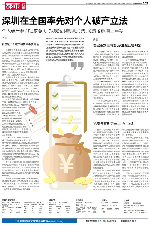 南都讯 记者张小玲 深圳率先在全国对个人破产进行立法,昨日公开征求意见的《深圳经济特区个人破产条例(征求意见稿)》提出,50万元是破产清算申请的门槛,并提出限制高消费、从业禁止等规定。免责考察期为三年